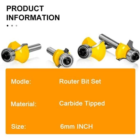 FORFAIT COMPREND: Ensemble de mèches de toupie1, bords arrondis, au-dessus de la tige,Remarque: Ă©vitez de couper du mĂ©tal ferreux et des matĂ©riaux autres que le bois, tels que l’acier, le fer