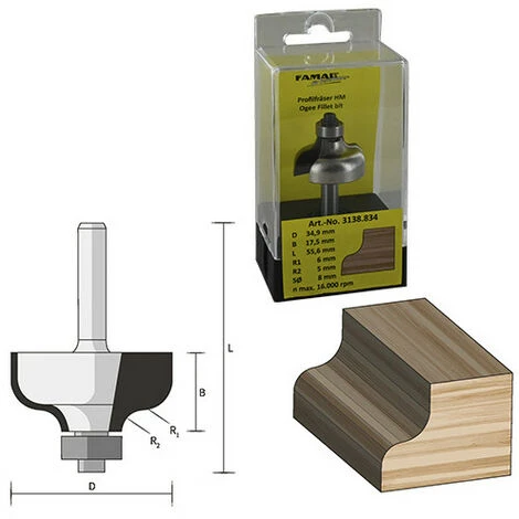 - Mèche de défonceuse : Fraise à doucine D. 34,9 mm Ht. 17,5 mm R6°/5° Lt. 55,6 mm Queue 8 mm + Roulement à billes