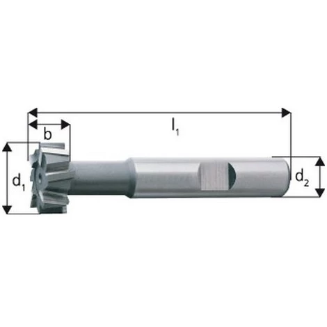 Fraise pour rainures en T, Ă x largeur d1=d11 x b = d11 : 25,0 x 11 mm, Longueur totale l1 82 mm, pour rainures en T, DIN 650 14, Ă de col env. : 12,0 mm, DiamĂštre de la queue d2 = h6 : 16 – HSS Ă 5% de cobalt – Type N – DIN 851-AB – DĂ©coupant sur le pourtour et sur les deux cĂŽtĂ©s – Pour fraiser les fentes T selon DIN 650