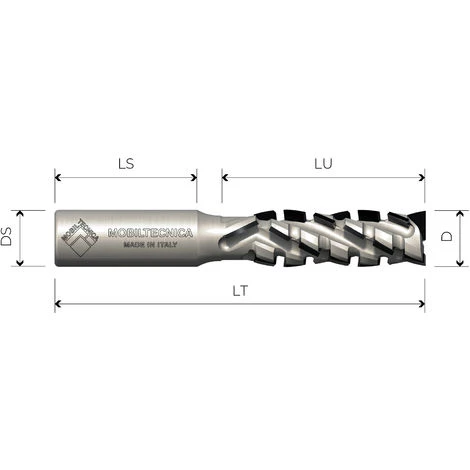 Fraise en diamant Z2+2, 4 divisions en hĂ©lice, axialitĂ© des taillants essentiellement positive pour favoriser l’extraction du copeau en direction du raccord.